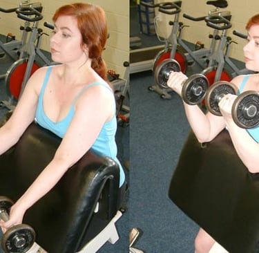 Performed seated, concentration curls isolate the biceps for peak contraction. Rest your elbow on your inner thigh and curl the dumbbell upward slowly, focusing on control and form.